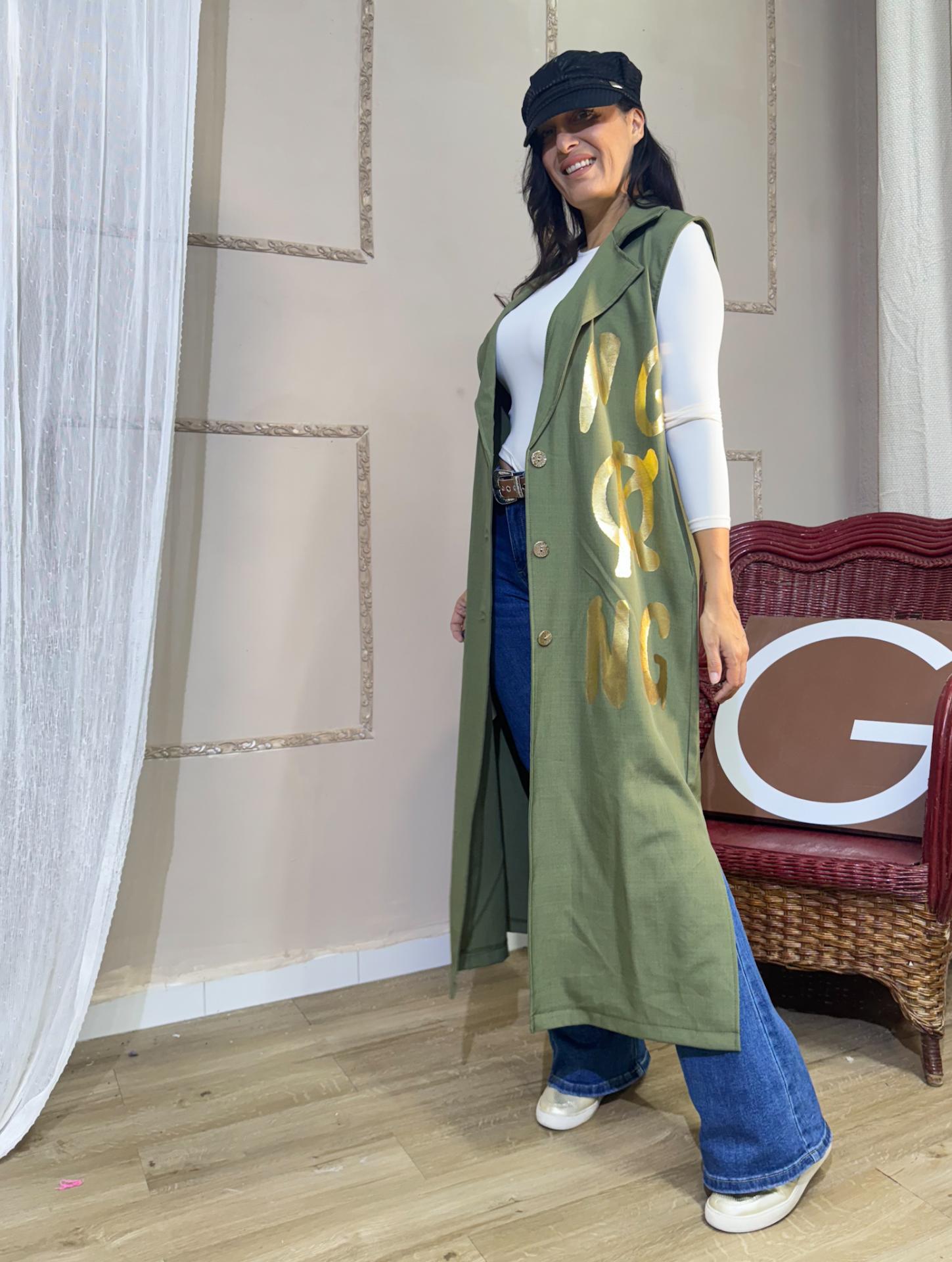 CHALECO LARGO LETRAS DORADAS