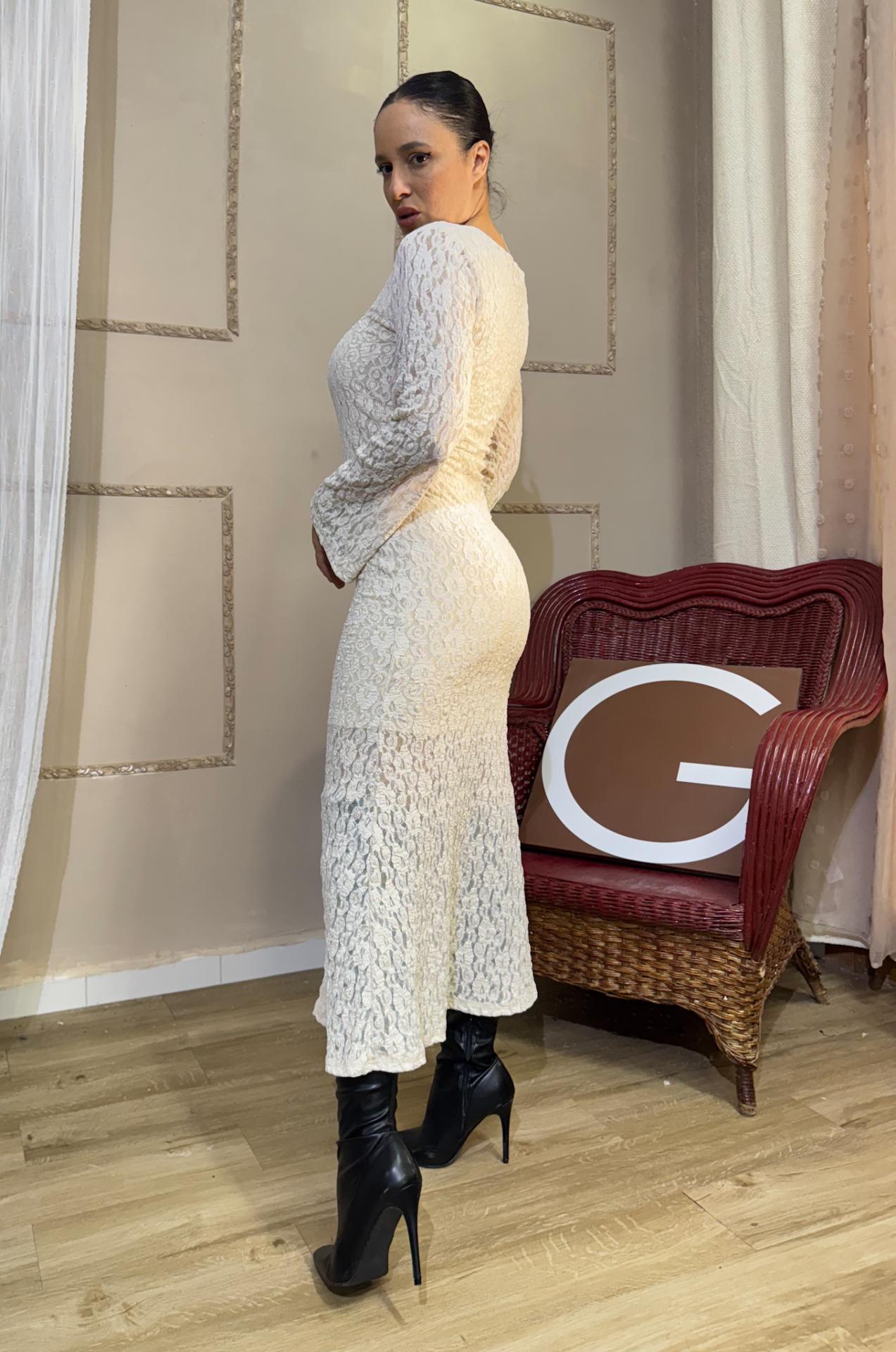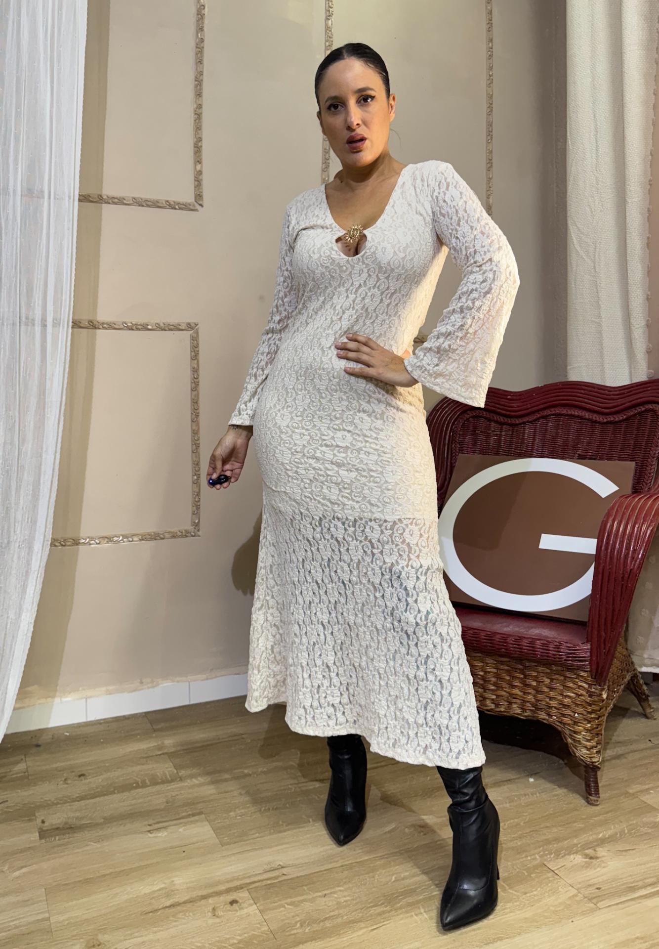 VESTIDO BEIG DE MANGA LARGA FIESTA DE ENCAGE LARGO BROCHES DE SOL