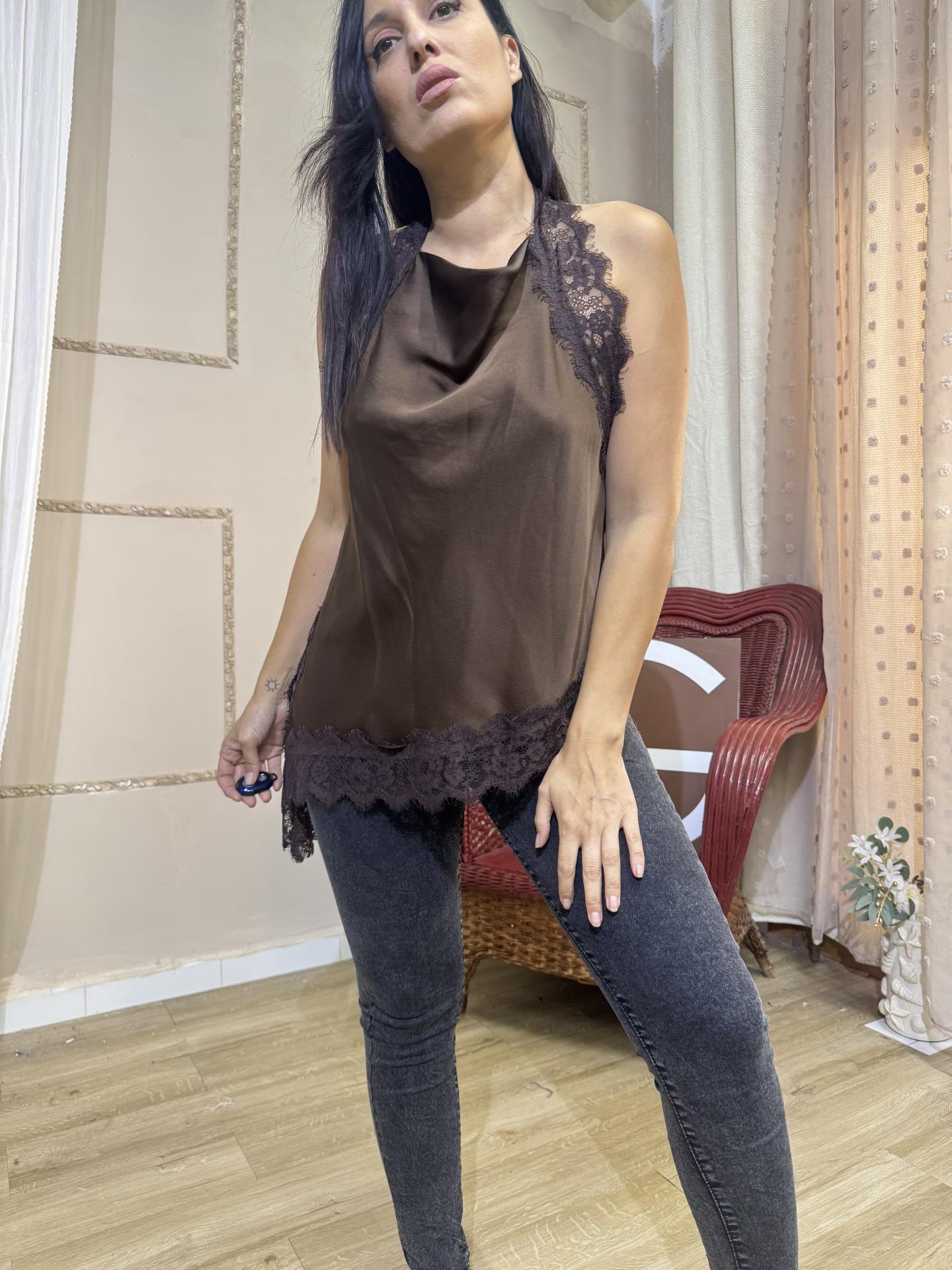 LENCERA MARRON COGIDA AL CUELLO DE RASO CON ENCAGE