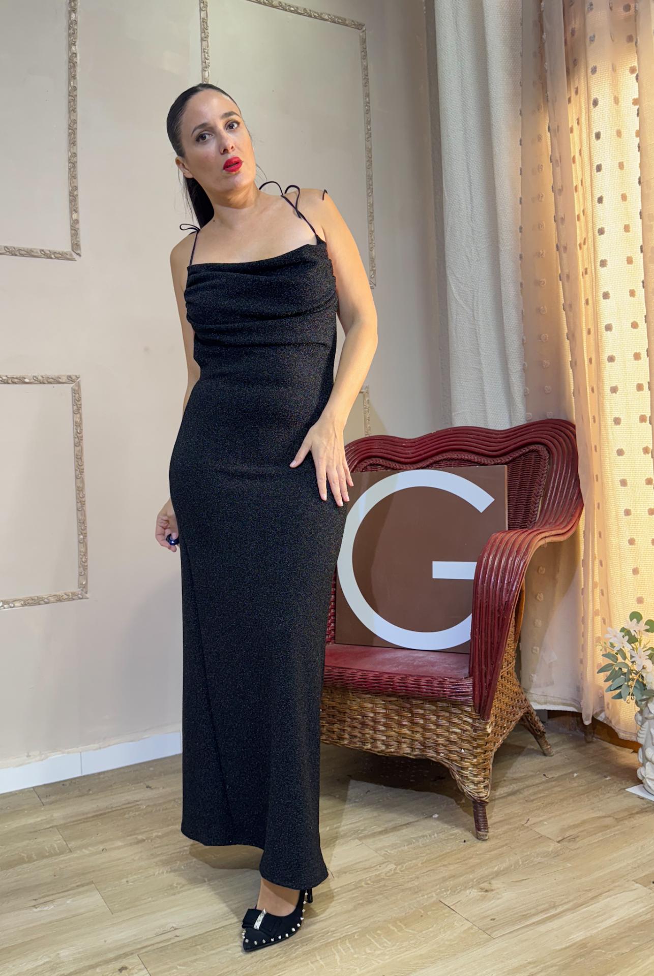VESTIDO NEGRO DE FIESTA ESPALDA AL AIRE TIRANTE CON LAZADA