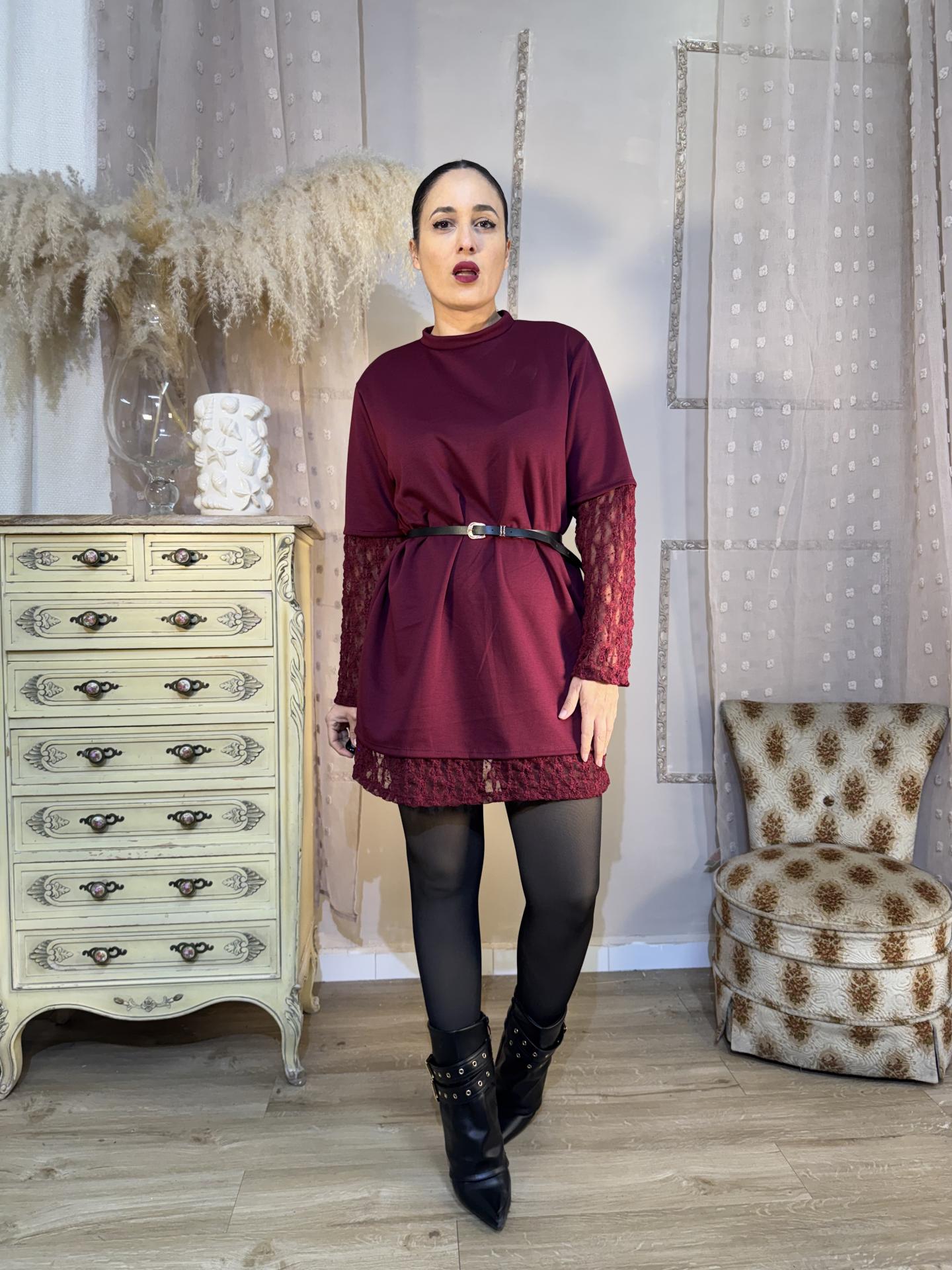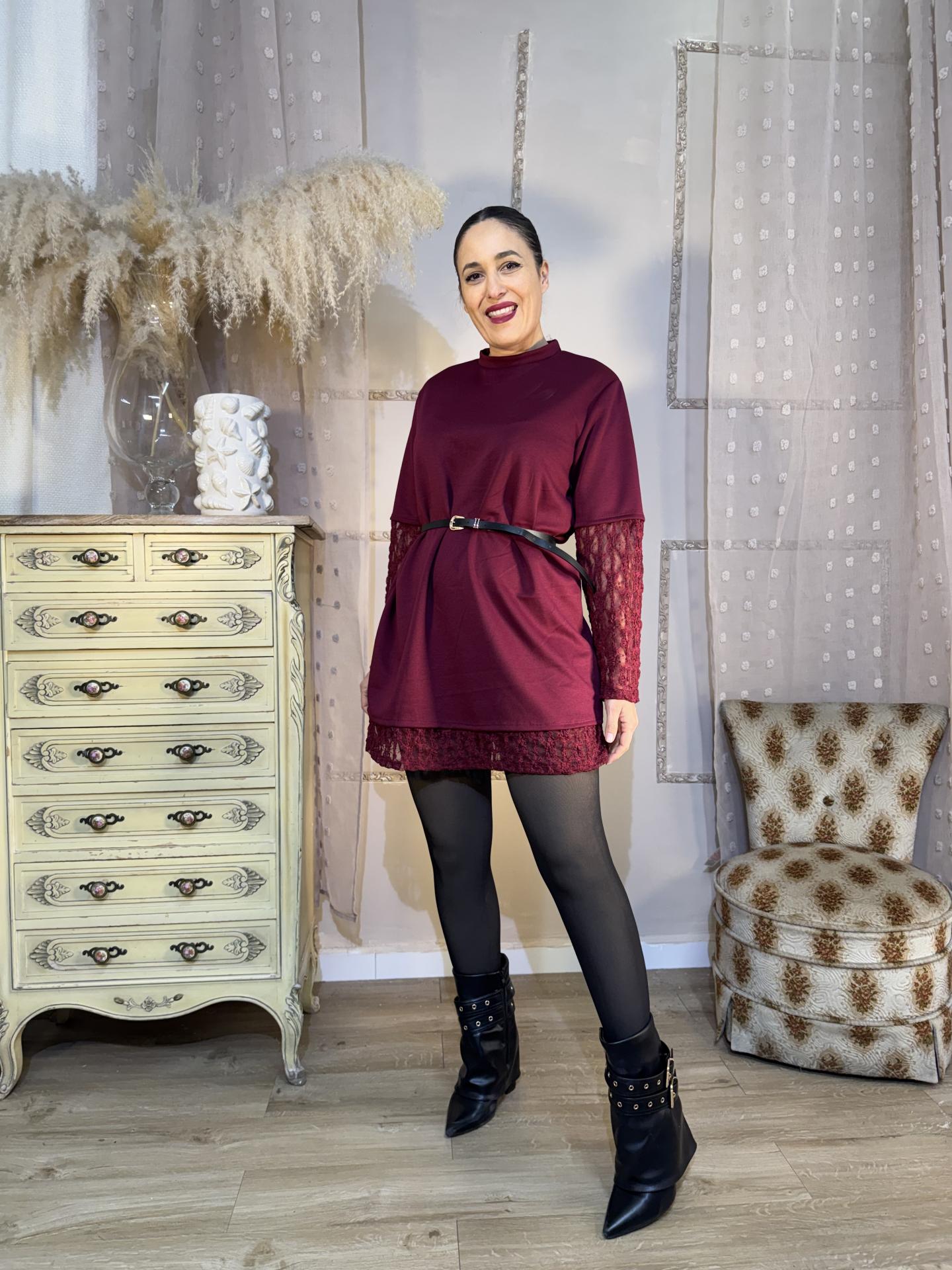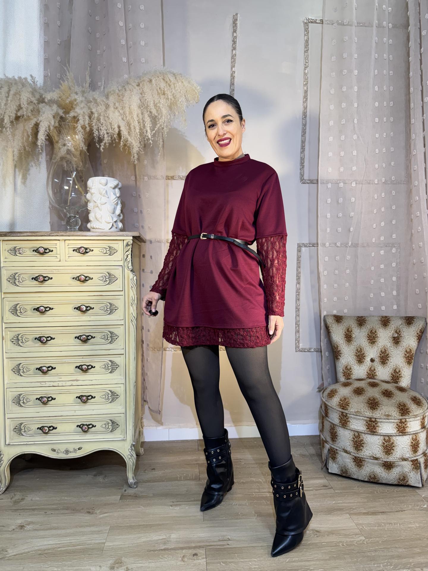 VESTIDO GRANATE MANGAS ENCAJE